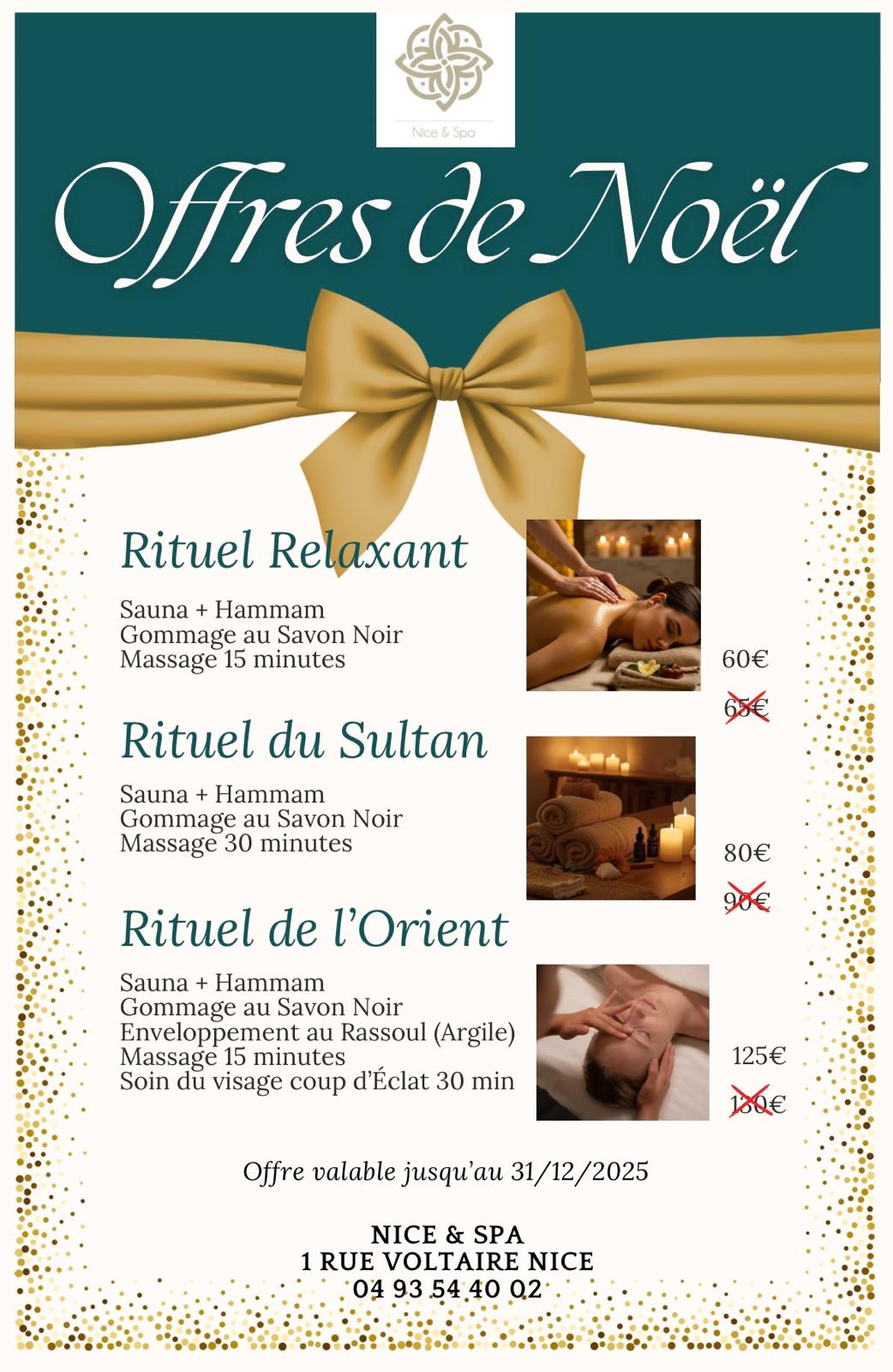 En complément de votre séance de hammam, Nice & Spa vous propose une gamme étendue de soins personnalisés pour répondre à vos besoins spécifiques. Massages relaxants, gommages exfoliants, enveloppements nourrissants, chaque prestation est conçue pour sublimer votre expérience de bien-être et vous offrir des instants de pure détente.